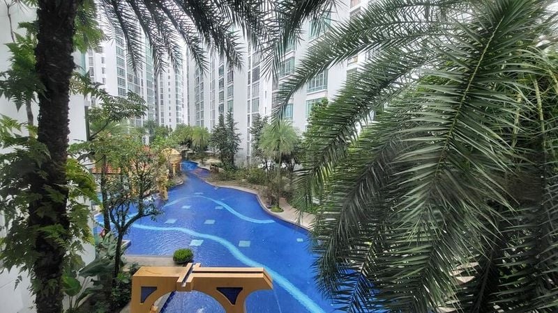 Step into a serene oasis at The Lakeshore, where the ambiance is both functional and cozy. The well-maintained unit welcomes you with moderate natural light filtering through large windows, offering captivating views of the lush greenery and the inviting swimming pool. The tasteful finishes create a warm atmosphere, perfect for relaxation and entertaining.