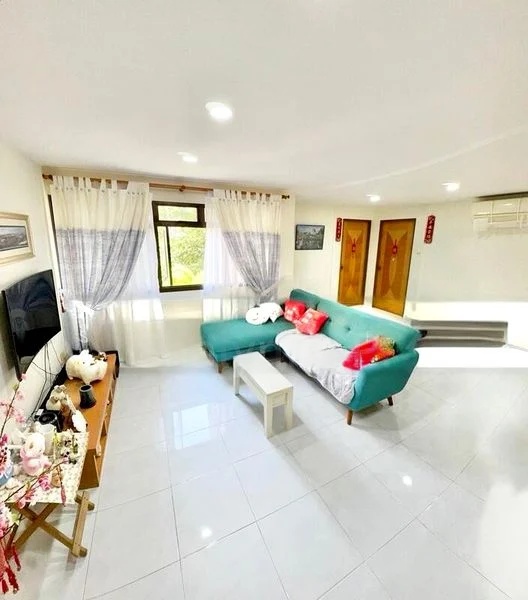 Step into a world of character with this eclectic 3-bedroom flat, where a decorative sky-themed ceiling mural greets you, inviting a sense of whimsy and creativity. The living room, adorned with patterned upholstery sofas, offers a cozy yet vibrant ambiance, complemented by stained glass ceiling panels that filter light in a unique way. Although natural light is limited, the charm of the space is undeniable, making it a perfect canvas for your personal touch.