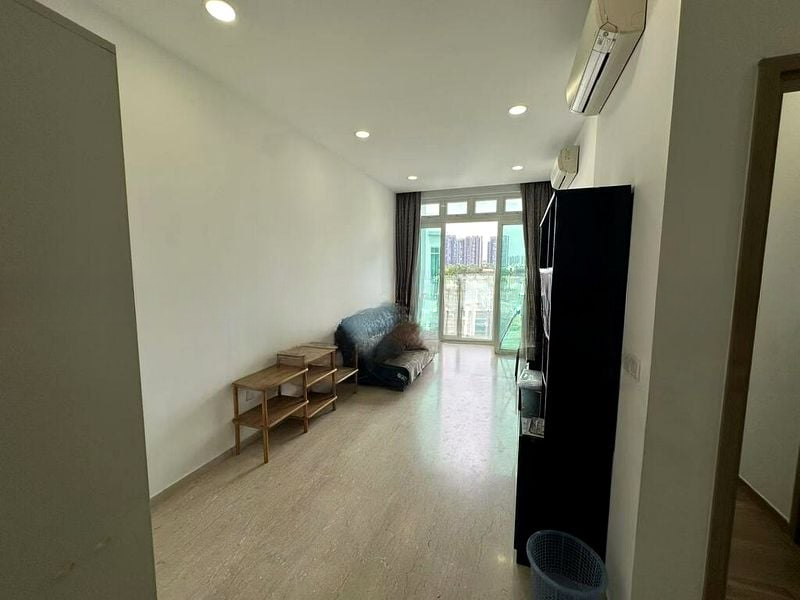 Step into a serene oasis where modern minimalism meets functionality. The open-plan living area welcomes you with its wood-look flooring, bathed in natural light from the large window that frames unobstructed views of low-rise residential greenery and a distant city skyline. The ambiance is both calming and stylish, enhanced by the glass balcony railing that invites you to enjoy the fresh air.