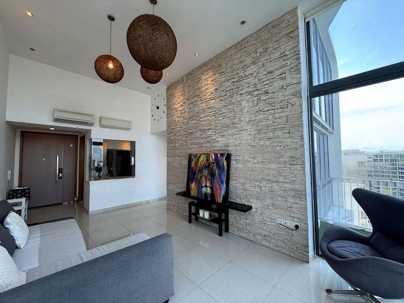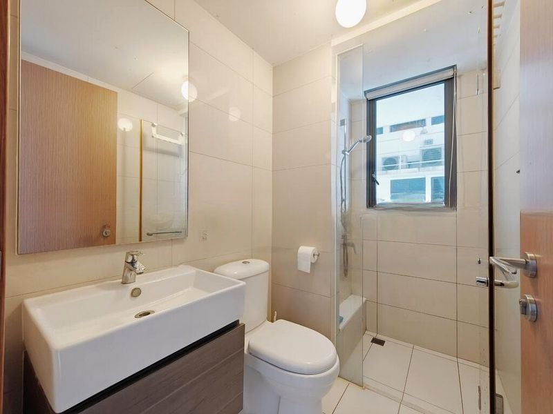 Step into a bright and airy sanctuary at Belysa, where abundant natural light floods the open-plan living and dining area, creating an inviting ambiance. The modern finishes, including recessed ceiling lighting and large windows, enhance the spacious feel, while the views of the pool and lush greenery from the balcony provide a serene backdrop for relaxation.