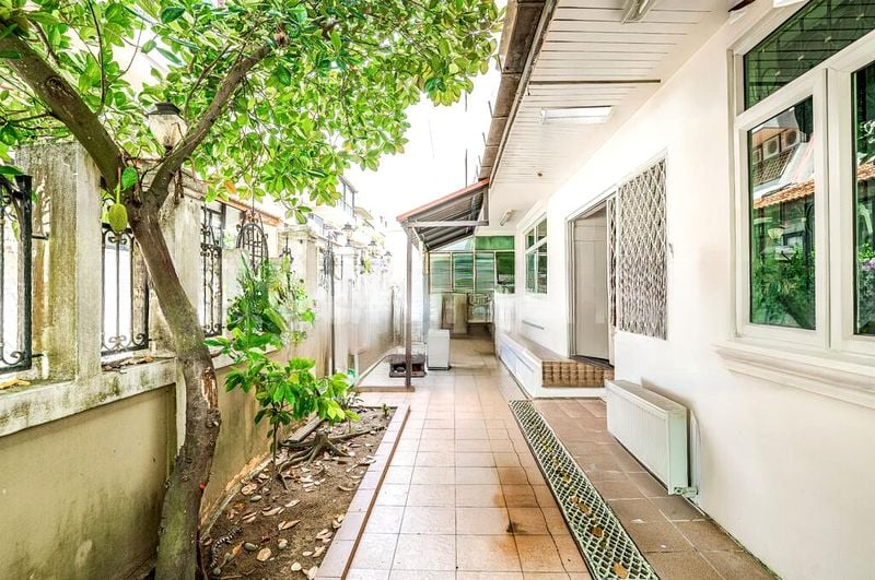 This well-maintained landed unit boasts seven generous bedrooms, each adorned with warm wooden flooring and unique accents. The standout feature is the expansive outdoor tiled terrace, perfect for entertaining or unwinding amidst mature fruit trees. The polished tile flooring in the living room complements the inviting layout, while the private garden with wooden decking offers a tranquil escape.