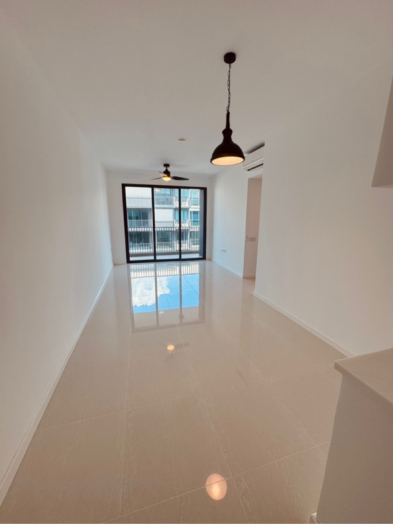Step into a world of modern elegance as you enter this brand-new unit at Treasure at Tampines. Bathed in abundant natural light, the open living space features polished tile flooring and a sleek black pendant light, seamlessly connecting to a balcony that offers unobstructed views of the pool and city skyline. The ambiance is both inviting and sophisticated, perfect for relaxation or entertaining.