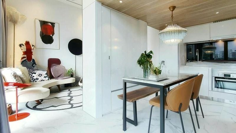 Step into a bright and airy sanctuary at SEAHILL, where abundant natural light floods the open concept living space, accentuating the stunning sea and harbor views. The inviting ambiance is enhanced by floor-to-ceiling curtains and a stylish kitchen island, perfect for entertaining or enjoying a quiet evening at home.