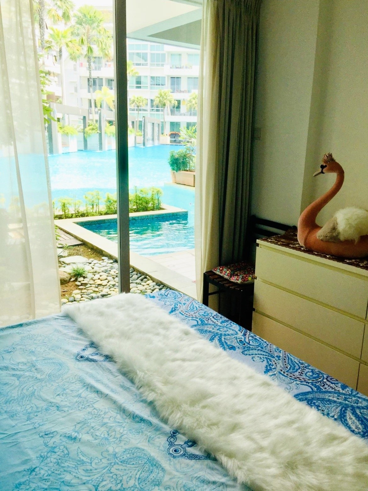This thoughtfully designed unit features a spacious living room seamlessly integrated with the dining area, perfect for entertaining. The modern kitchen boasts a stylish white breakfast bar, complemented by ample cabinetry and essential appliances. With direct access to the pool from your balcony, every day feels like a vacation in this idyllic setting.