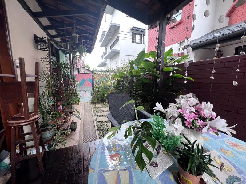 Step into a serene sanctuary where eclectic charm meets cozy living. As you enter, the vibrant green walls and large windows invite natural light, creating a warm ambiance that instantly makes you feel at home. The covered outdoor patio, adorned with wooden decking and surrounded by lush tropical landscaping, offers a perfect retreat to unwind while enjoying views of the manicured garden and neighboring greenery.