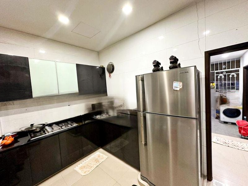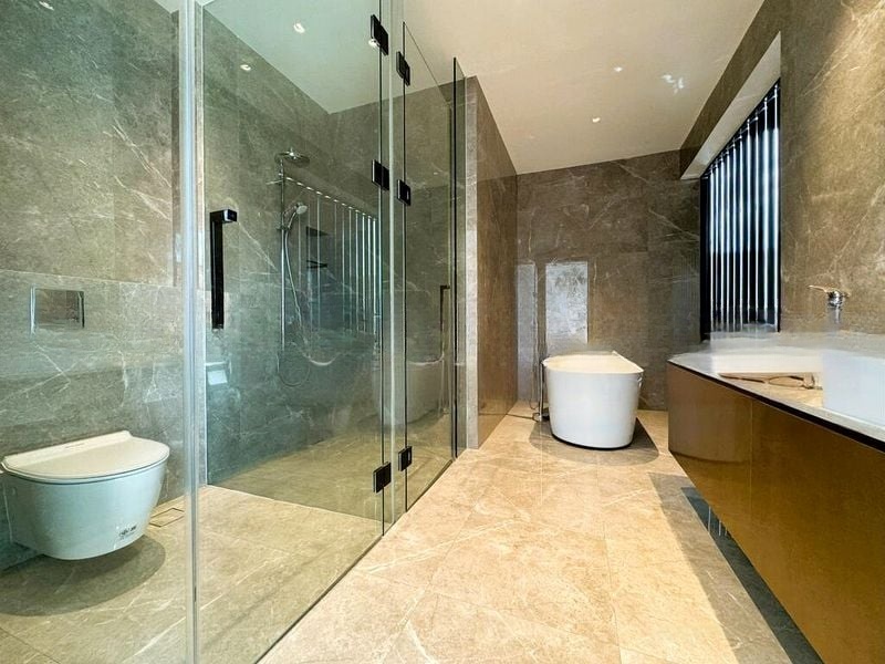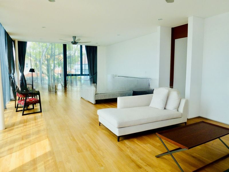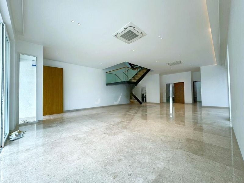 Step into this exquisite landed property and be greeted by an ambiance that is both bright and airy, thanks to the abundant natural light streaming through the floor-to-ceiling glass walls. The double-volume living room, adorned with a wood-slatted ceiling and designer chandeliers, offers captivating views of the lush greenery and serene pond, creating a tranquil retreat right at home.