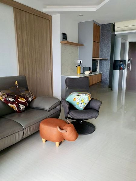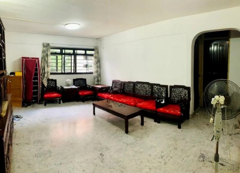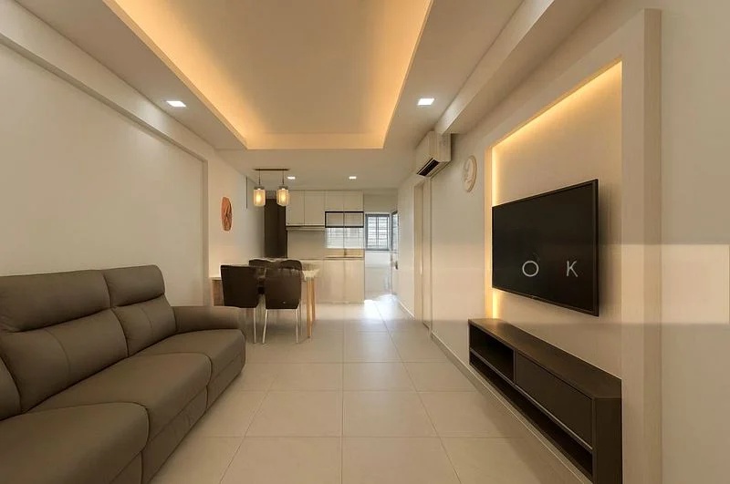 Step into a warm and inviting atmosphere where the charm of original finishes meets cozy living. The well-maintained unit features a tiled living room adorned with an L-shaped leather sofa, complemented by a wooden TV console and a wall-mounted mirror, creating a comfortable space for relaxation. Natural light may be limited, but the ambiance is undeniably welcoming, perfect for unwinding after a long day.