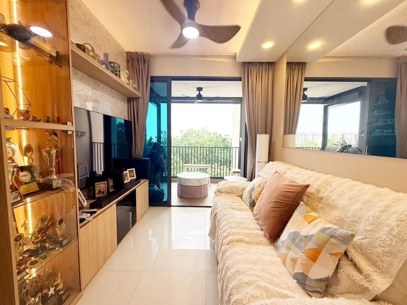 Step into a sanctuary of modern minimalism at Treasure at Tampines, where abundant natural light floods the open-concept living space, accentuating the sleek finishes and elegant design. The floor-to-ceiling built-in storage in the entryway, enhanced by warm LED strip lighting, sets a welcoming tone, while the living room boasts a false ceiling with cove lighting and a large mirror wall that creates an illusion of space and tranquility.
