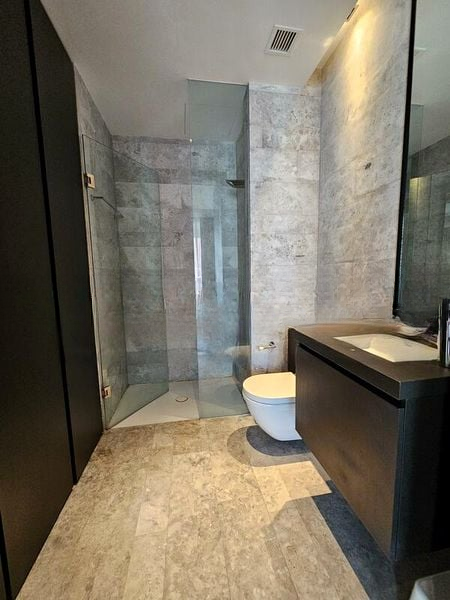 This well-maintained 1-bedroom unit features high-quality finishes, including light wood flooring and dark wood cabinetry that harmoniously blend style and functionality. The integrated dining island enhances the space, while the modern stone-tiled bathroom boasts a glass shower enclosure and wall-hung toilet, ensuring a luxurious experience. With an efficient layout, this home is perfect for both relaxation and entertaining.