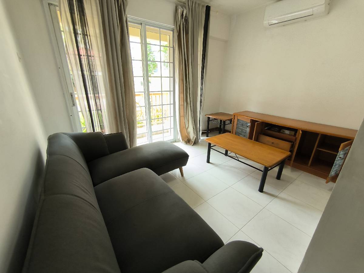 Step into a functional and inviting space where simplicity meets comfort. This fully-furnished 3-bedroom unit at Melville Park welcomes you with moderate natural light filtering through sliding glass doors that lead to a charming balcony, offering serene views of lush greenery. The ambiance is perfect for relaxation, with an L-shaped grey sofa and wooden accents that create a warm, homey feel.