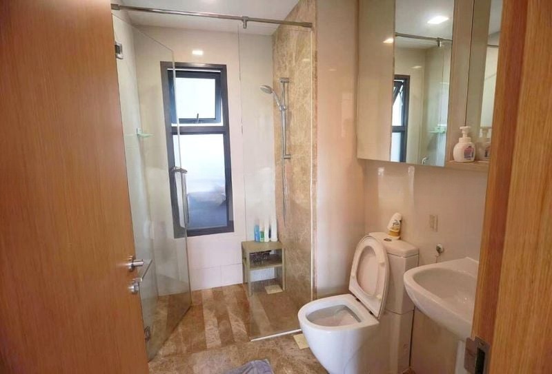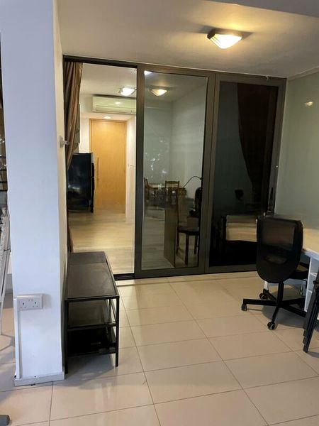 Step into a warm and inviting space where natural light filters through floor-to-ceiling glass doors, illuminating the cozy interiors of this well-maintained 1-bedroom unit. The dark wood parquet flooring in the bedroom adds a touch of elegance, while the balcony offers a serene view of lush greenery, perfect for relaxation.