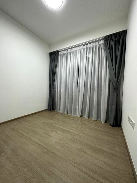 Step into a world of modern elegance as you enter this brand-new 1-bedroom unit at Affinity at Serangoon. The abundant natural light pours in through large black-framed windows, illuminating the open-concept living area adorned with exquisite marble-look floor tiles. Sliding glass doors lead to a private balcony, offering serene views of lush greenery and the urban skyline, creating a perfect backdrop for relaxation.