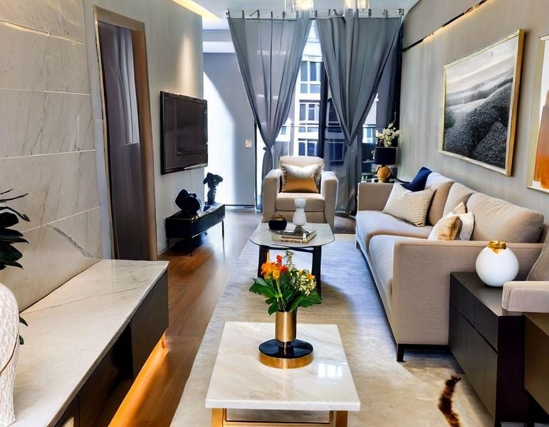 Step into a world of modern luxury as you enter this beautifully designed unit at La Fiesta. The open-plan living room greets you with a stunning marble-look feature wall, complemented by recessed lighting that creates a warm ambiance. Enjoy the gentle breeze from your private balcony, offering unobstructed views of the sparkling pool and lush greenery, perfect for unwinding after a long day.