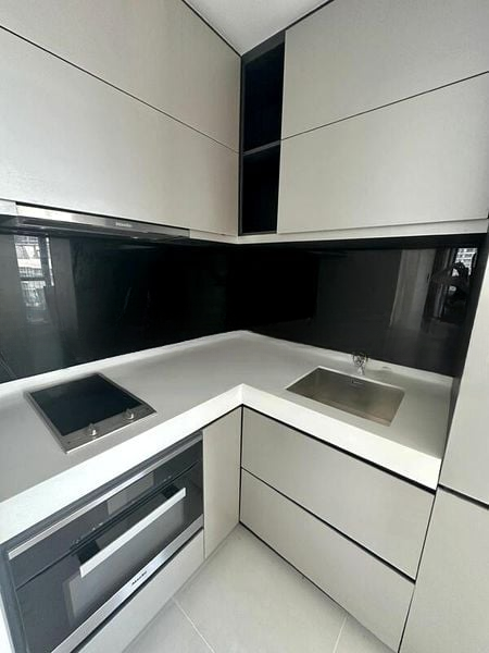 This 94 sqm unit features an open-concept layout that seamlessly connects the living area and kitchen. The kitchen is a chef's dream, equipped with integrated Miele appliances, sleek black glass backsplash, and white quartz countertops. Ascend the modern staircase with its striking black metal frame and tempered glass railings to discover the master bedroom in the attic, offering privacy and ample storage space.
