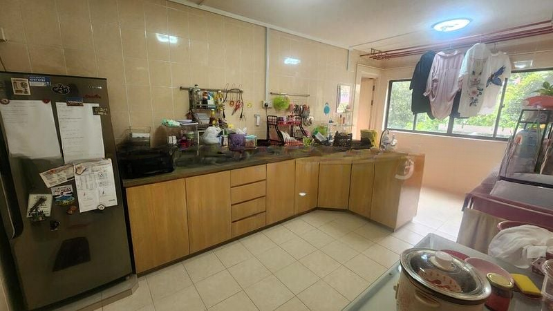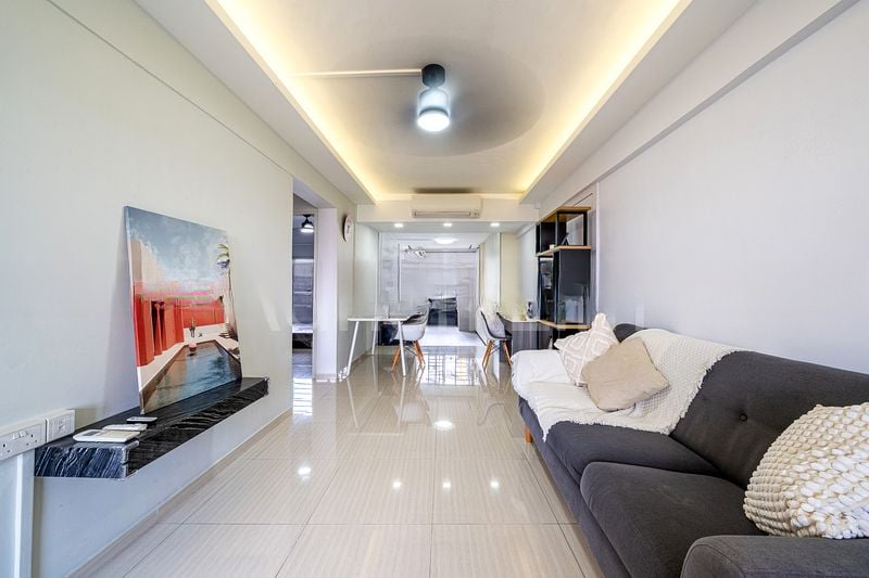 Step into this inviting HDB flat where the charm of original terrazzo flooring greets you, complemented by a whimsical sky-themed ceiling mural that adds a touch of creativity to the ambiance. The moderate natural light filtering through large windows creates a warm and functional atmosphere, perfect for both relaxation and daily living.