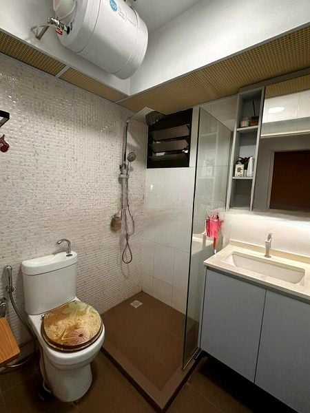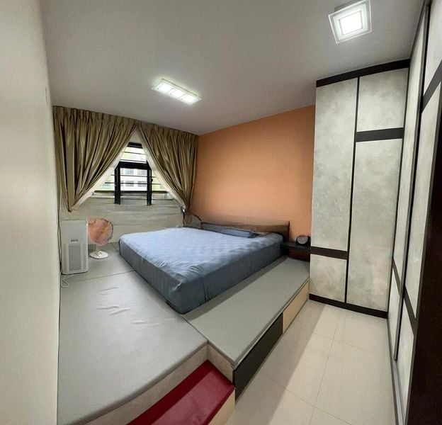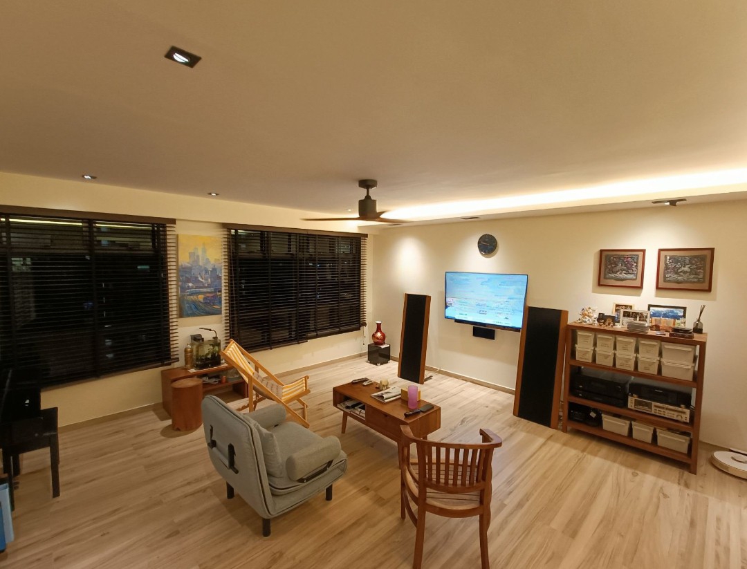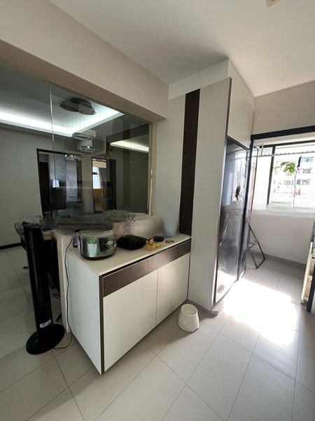 Step into a world of modern elegance as you enter this beautifully renovated 3-bedroom HDB flat. The polished tile flooring reflects the ambient cove lighting, creating a warm and inviting atmosphere. Enjoy the urban landscape views from your living room, enhanced by extensive full-height built-in cabinetry and stylish wooden venetian blinds that complement the minimalist design.