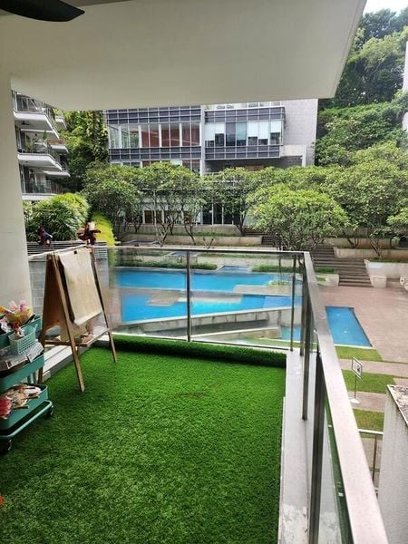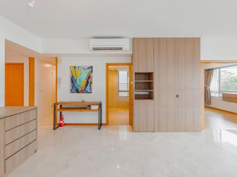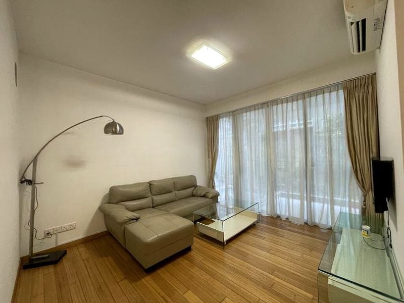 Step into this beautifully renovated 1-bedroom unit at 8 @ Mount Sophia, where abundant natural light floods the open-plan living space, creating a bright and airy ambiance. The marble-look floor tiles and light wood flooring enhance the modern aesthetic, while sliding glass doors lead to a spacious balcony adorned with elegant wood decking, perfect for relaxation or entertaining.