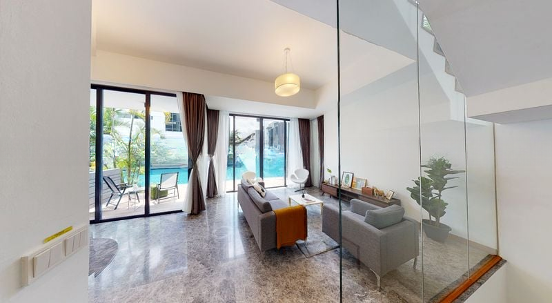 Step into a world of elegance and tranquility as you enter this beautifully designed townhouse at Alana. The abundant natural light floods the space, highlighting the polished marble flooring and the stunning views of the lap pool and lush greenery. With floor-to-ceiling windows and an airy ambiance, this home invites you to relax and unwind in style.