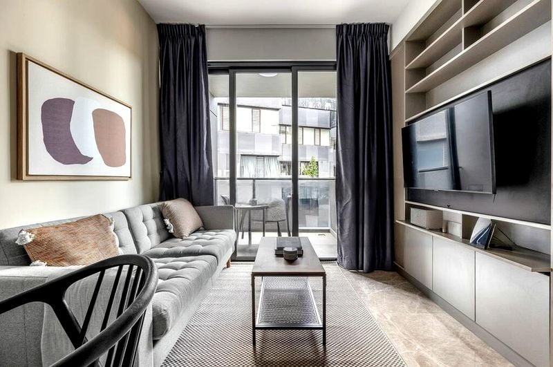 This thoughtfully designed unit features a compact kitchen with sleek grey and black cabinetry, integrated shelving, and a stainless steel sink, perfect for culinary enthusiasts. The bedroom boasts light wood flooring and built-in wardrobes with sliding doors, ensuring ample storage while maintaining a clean aesthetic. The bathroom is equally impressive, showcasing stone-look wall tiles and a glass shower partition, adding a touch of luxury to your daily routine.
