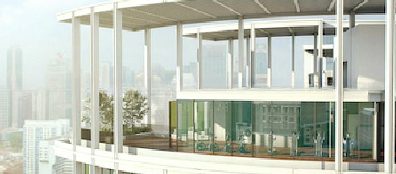 Step into a bright and airy sanctuary at ONE PEARL BANK, where abundant natural light floods through floor-to-ceiling windows, showcasing breathtaking panoramic views of the city skyline and lush greenery. The modern architectural facade, complemented by integrated greenery, creates an inviting ambiance that feels both luxurious and serene.