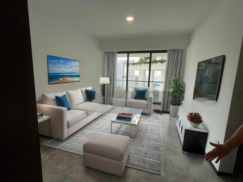 This well-maintained 2-bedroom unit features exquisite marble flooring throughout, enhancing the elegant design. The spacious living room is perfect for entertaining, adorned with contemporary furnishings and an indoor potted plant that adds a touch of nature. The large corner windows in the bedrooms invite in natural light, while the recessed ceiling lights create a cozy atmosphere. Step out onto the triangular balcony with glass and metal railings, where you can unwind and soak in the unobstructed views of the park.