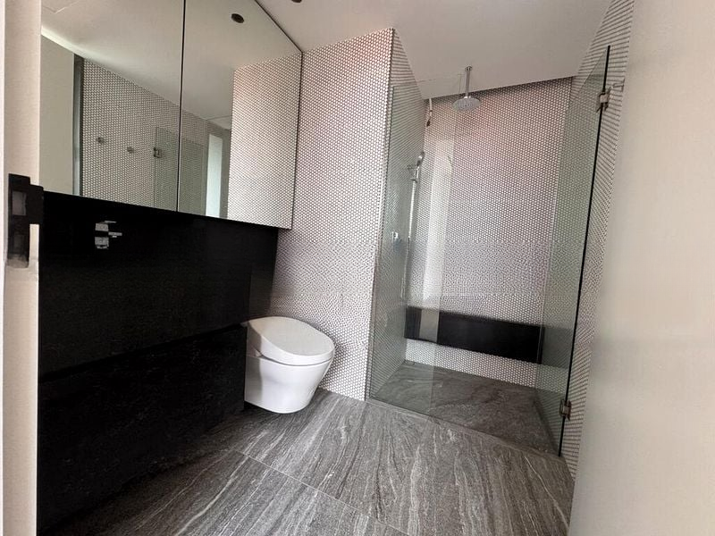 This efficient 2-bedroom, 2-bathroom layout boasts standout features such as a master en-suite with stylish wood paneling and a mirrored vanity nook in the study area. The kitchen is a culinary delight with integrated appliances, sleek white countertops, and dark cabinetry that harmonize beautifully. The private enclosed space (PES) adds versatility to your lifestyle, making it ideal for entertaining or quiet reflection.
