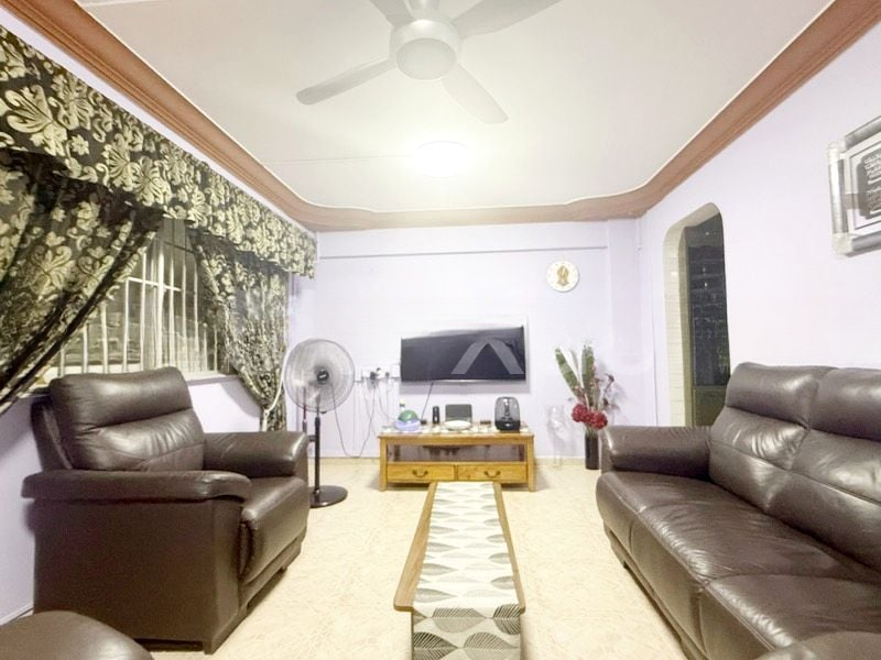 Step into a warm and inviting atmosphere where cozy living meets practicality. This 3-bedroom HDB flat features a spacious layout, complemented by moderate natural light filtering through patterned curtains. The brick-patterned feature wall adds character, while the ceiling fans enhance the lived-in charm, making it a perfect retreat after a long day.