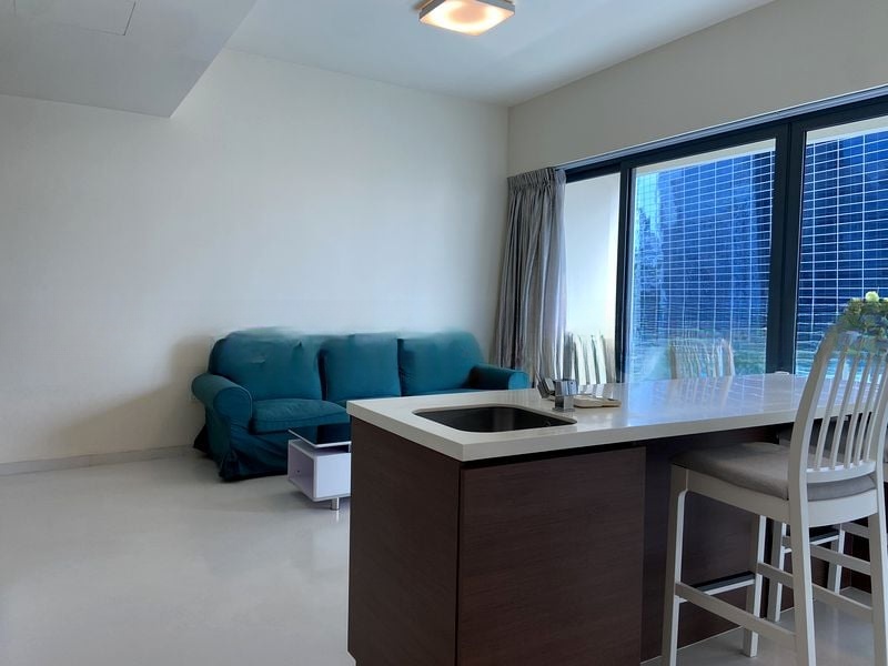 Step into a world of modern elegance as you enter this beautifully renovated 1-bedroom unit at Soleil @ Sinaran. The open-concept living area greets you with warm wooden flooring, complemented by a geometric rug that adds a touch of sophistication. Natural light filters through large windows, illuminating the sleek finishes and providing a stunning view of the city skyline.