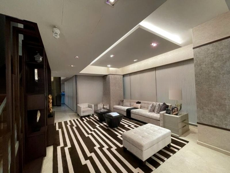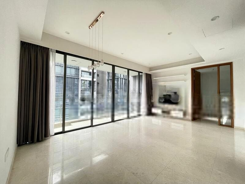 Step into a bright and airy sanctuary at ONE-NORTH RESIDENCES, where abundant natural light floods through the floor-to-ceiling windows, showcasing stunning views of lush greenery. The modern minimalist design creates an inviting ambiance, enhanced by high ceilings and a glass staircase railing that adds a touch of elegance to the open concept living space.