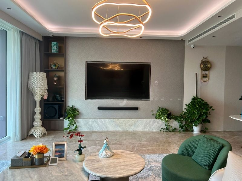 Step into a world of modern elegance as you enter this beautifully renovated unit at Corals at Keppel Bay. The abundant natural light floods the open-concept living space, highlighting the exquisite marble-look floor tiles and the striking designer branch chandelier. Floor-to-ceiling sliding glass doors invite you to enjoy breathtaking views of the city skyline, lush greenery, and the tranquil waterway, creating an ambiance that is both sophisticated and serene.