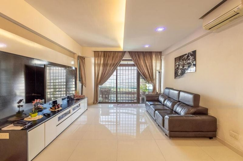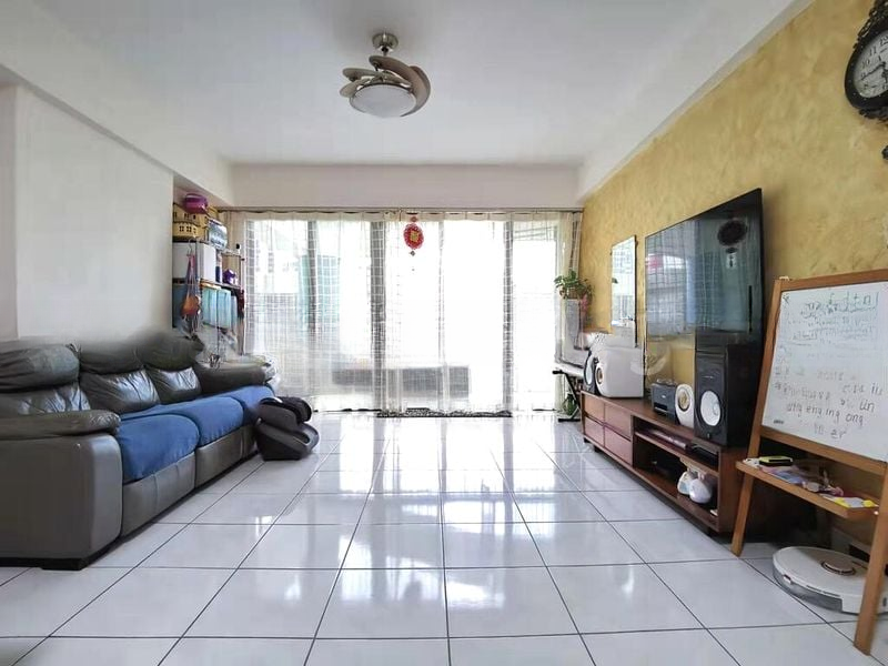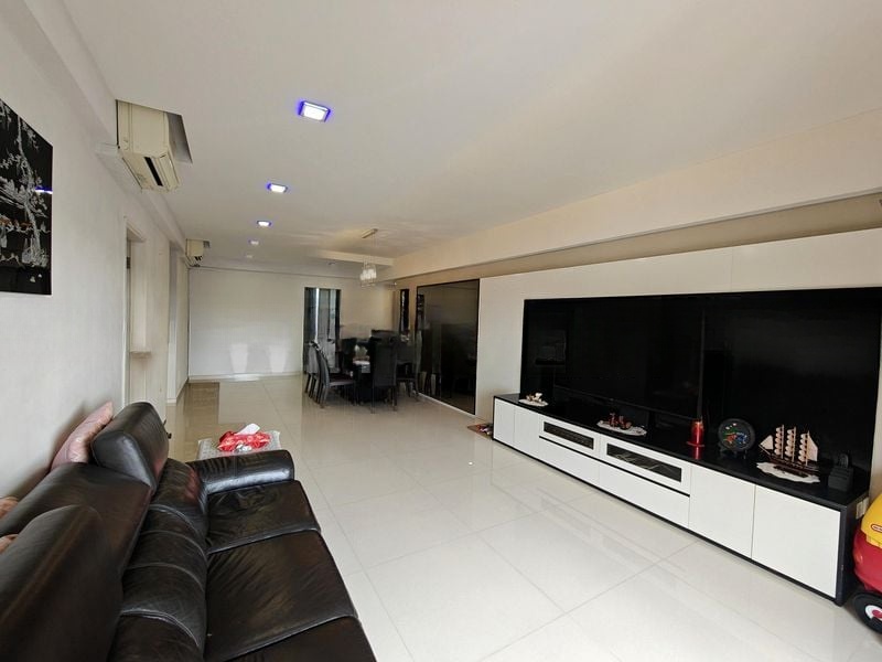 Step into this beautifully renovated unit at The Tanamera and be greeted by an abundance of natural light pouring through large windows, illuminating the polished floor tiles and open-concept living and dining area. The modern minimalist ambiance is enhanced by elegant herringbone parquet flooring and a striking feature wallpaper in the entryway, creating an inviting atmosphere that feels both spacious and sophisticated.