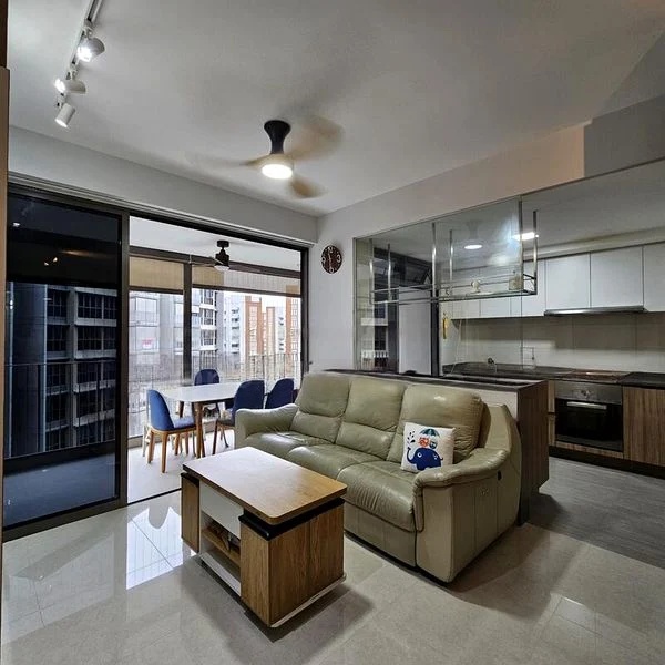 Step into a world of modern elegance with this beautifully renovated unit at Rivercove Residences. Bathed in natural light, the open-concept living area invites you to relax on the leather sofa, while the enclosed balcony dining area offers a unique space to entertain against an urban backdrop. The sleek finishes, including wood-look bathroom tiles and glass-enclosed kitchen shelving, create a sophisticated ambiance that feels both inviting and stylish.