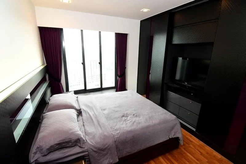 This spacious 3-bedroom unit boasts a seamless layout, perfect for contemporary living. The living room flows effortlessly into the dining area, featuring a mirrored wall and designer red chairs that add a pop of colour. The master bedroom is a sanctuary with built-in black wardrobes and an integrated TV console, while the additional bedroom is thoughtfully designed with a built-in study desk. Every corner of this home reflects quality craftsmanship and attention to detail.