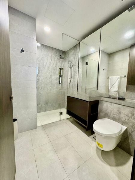 Step into this brand-new, fully-furnished unit at Parc Clematis, where modern minimalist design meets comfort. The polished marble-look floor tiles reflect natural light, creating an inviting ambiance. Enjoy breathtaking views of the pool and city skyline through the floor-to-ceiling sliding glass doors, while the L-shaped sofa and elegant wooden coffee table invite relaxation.