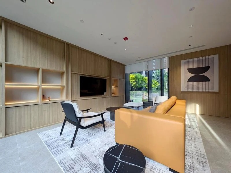 Step into a world of modern luxury as you enter this brand-new 1-bedroom plus study unit at Tembusu Grand. The designer renovation captivates with its elegant finishes, including a floating bed with under-lighting and a marble kitchen backsplash that gleams under the soft glow of cove lighting. Floor-to-ceiling windows invite natural light, creating a warm ambiance while offering serene views of greenery and the neighboring landscape.