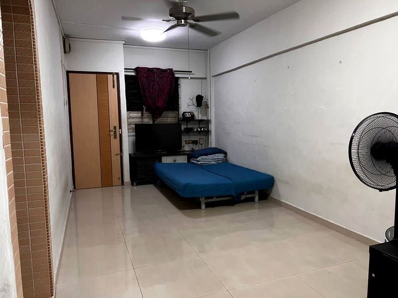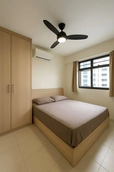 Step into a well-maintained 2-bedroom flat that exudes a simple yet functional ambiance. The moderate natural light filters through the windows, illuminating the living space adorned with square floor tiles and a geometric pattern area rug. The built-in floor-to-ceiling wardrobe in the bedroom adds a touch of elegance, while the ceiling fan with integrated light and wall-mounted air conditioning ensure comfort throughout the day.
