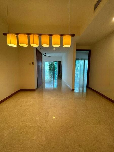 Step into a world of elegance as you enter this bright and airy unit at The Berth By The Cove. The polished stone flooring reflects abundant natural light, creating an inviting ambiance that instantly makes you feel at home. Large windows frame picturesque views of lush greenery and neighboring buildings, while designer pendant lighting adds a touch of sophistication to the living and dining area.