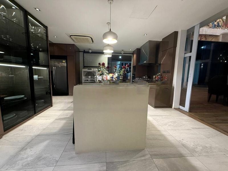 This well-maintained condominium features a thoughtful layout with four generous bedrooms and four bathrooms, perfect for family living. The L-shaped kitchen is equipped with modern appliances, including a large refrigerator and a stylish chimney hood, making it a joy to cook and entertain. The dining area, adorned with a pendant light and dark wood sideboard, is perfect for gatherings, while the outdoor stone path leads you through a lush garden adorned with mature trees and tropical plants.
