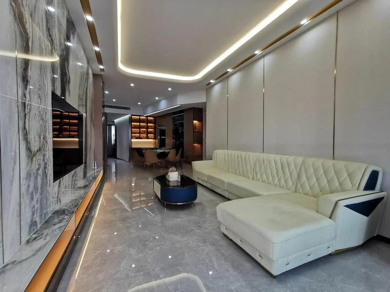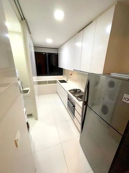 Step into a world of modern elegance as you enter this beautifully renovated 2-bedroom unit at D'LEEDON. The abundant natural light floods through the floor-to-ceiling windows, creating an inviting ambiance that seamlessly blends with the lush greenery and city skyline views from your private balcony. The minimalist design is accentuated by high-quality finishes, including white floor tiles and a stylish dark blue sofa that invites relaxation.