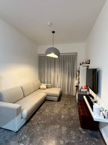 Step into a serene oasis where modern minimalist design meets functionality. The open-concept living room greets you with elegant marble-look floor tiles and ample natural light filtering through floor-to-ceiling windows, offering a refreshing view of lush greenery. The ambiance is enhanced by stylish track lighting and a cozy patterned area rug, creating a welcoming space to unwind.