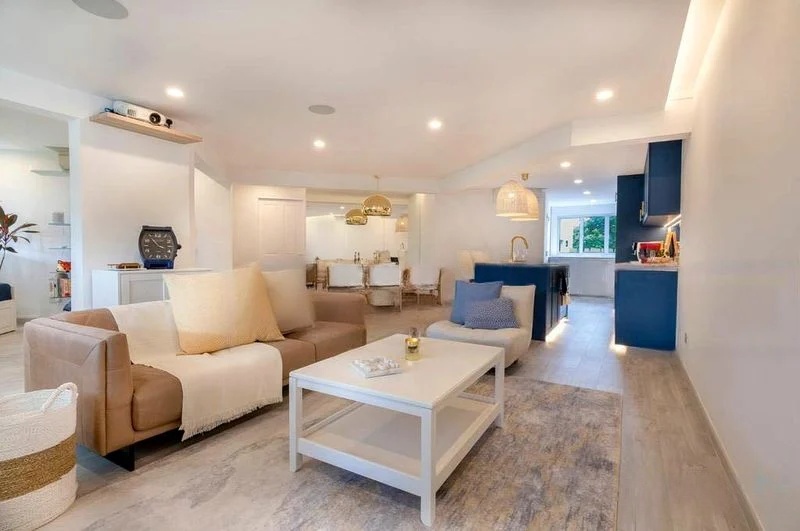 Step into this inviting 2-bedroom flat where moderate natural light filters through, enhancing the wood-look laminate flooring and creating a warm, functional ambiance. The spacious layout offers a sense of comfort, with a large built-in wardrobe in the bedroom and a practical galley kitchen that features white tiled walls, a gas stove, and an indoor laundry drying area.