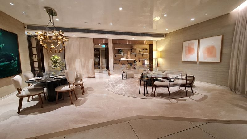 Step into a world of modern luxury at PARK NOVA, where abundant natural light floods the open-concept living space, highlighting the exquisite marble flooring and designer finishes. The floor-to-ceiling windows frame breathtaking views of the city skyline and lush greenery, creating an inviting ambiance that feels both elegant and serene.