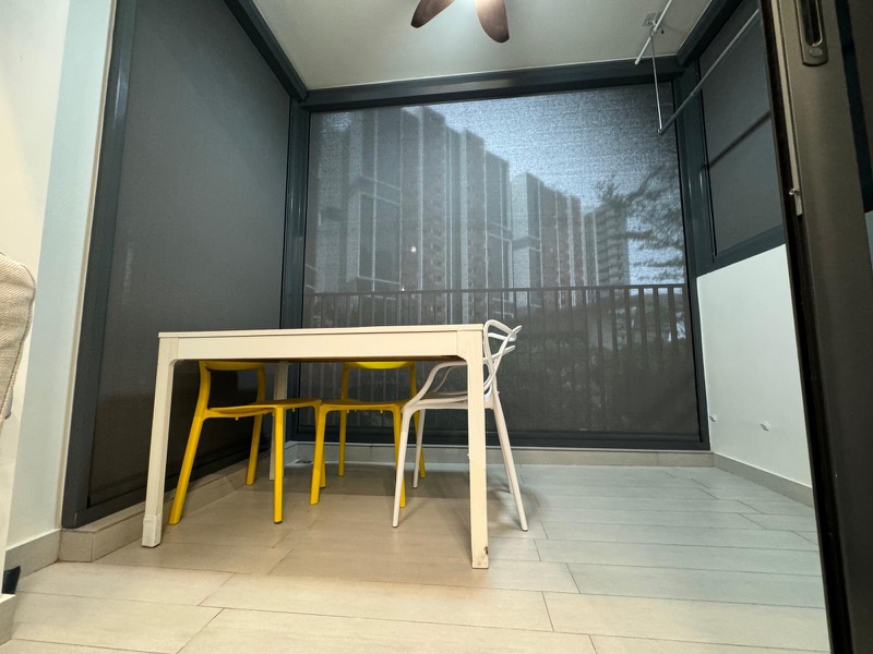 This efficient 1-bedroom layout (Type A2) spans 48 sqm / 517 sqft and features an open-concept kitchen equipped with integrated appliances, including an oven and washing machine. The living room, adorned with track lighting and a ceiling fan, seamlessly connects to an enclosed balcony, perfect for outdoor dining. The bedroom boasts recessed lighting and wood-look flooring, providing a cozy retreat.