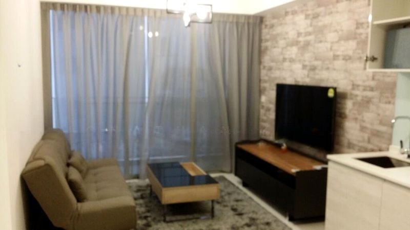 Step into a world of modern elegance as you enter this beautifully renovated 1-bedroom unit at Bartley Residences. The inviting living room boasts a striking brick-patterned feature wall, complemented by a chic lift-top coffee table and a soft grey shag rug. Natural light filters through sheer curtains, creating a warm ambiance that is both stylish and welcoming.