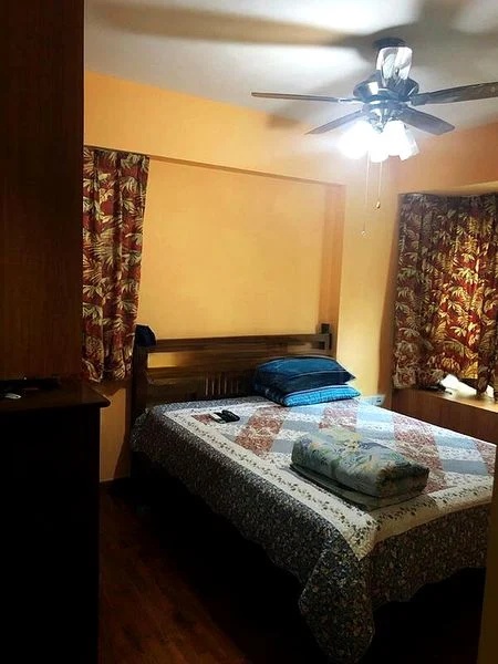 This well-maintained 3-bedroom unit boasts an open-concept layout, perfect for contemporary living. The sleek black cabinetry and wooden countertops in the kitchen complement the breakfast bar, making it an ideal spot for casual dining or entertaining. The living room features a stylish black leather sofa and a ceiling fan, ensuring comfort in every corner. The bedrooms, adorned with dark moody walls and recessed lighting, provide a cozy retreat.
