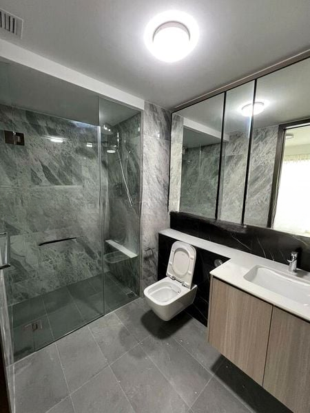 This thoughtfully designed unit features two spacious bedrooms, each with wood-look laminate flooring and built-in floor-to-ceiling wardrobes, ensuring ample storage. The bathrooms are a highlight, showcasing elegant grey marble-look wall tiles, a luxurious rain shower, and a sleek floating toilet, all complemented by a contemporary vanity cabinet. The layout maximizes comfort and functionality, making it perfect for modern living.