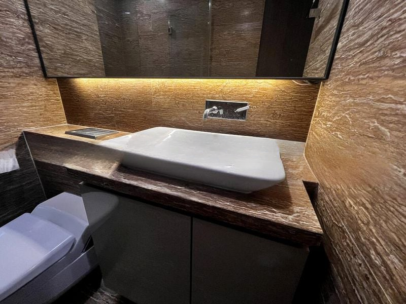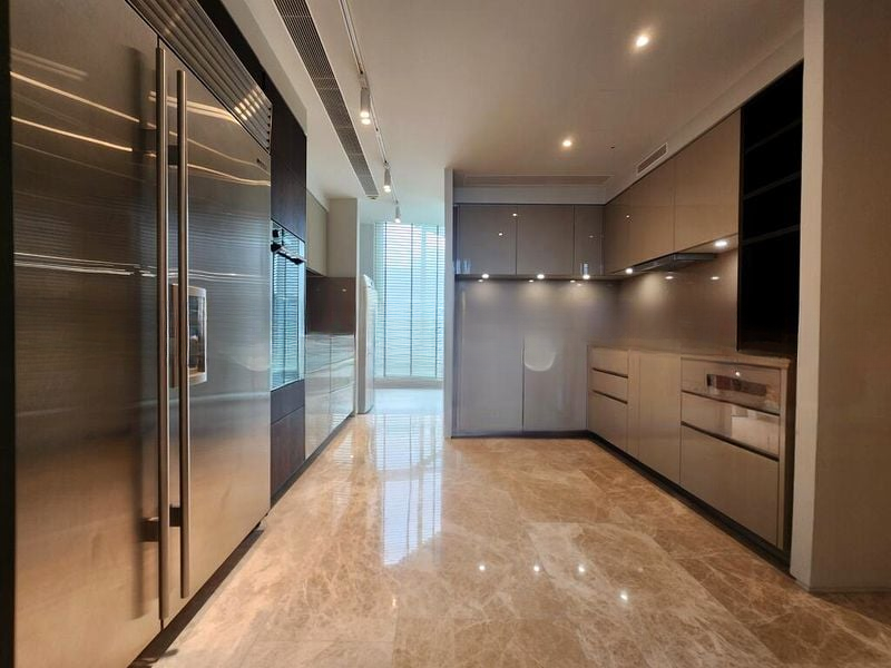 This spacious 3-bedroom, 3-bathroom unit features an open-concept living area adorned with high-gloss dark wood cabinetry and stylish copper pendant lights. The galley kitchen boasts high-gloss beige cabinetry, integrated appliances, and stone countertops, perfect for culinary enthusiasts. Each bedroom is designed for comfort, with light wood flooring and built-in high-gloss wardrobes, while the bathrooms showcase full stone tiling and modern fixtures, ensuring a spa-like experience at home.