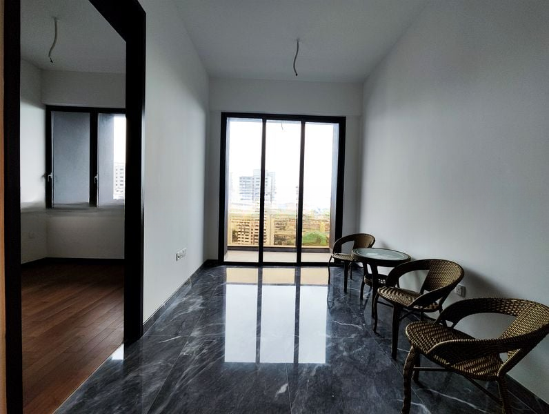 Step into a brand-new sanctuary where abundant natural light floods through large sliding glass doors, illuminating the elegant marble-patterned floor tiles that grace the living area. The airy ambiance invites you to unwind, while the balcony offers unblocked views of lush greenery and the city skyline, creating a perfect backdrop for relaxation.
