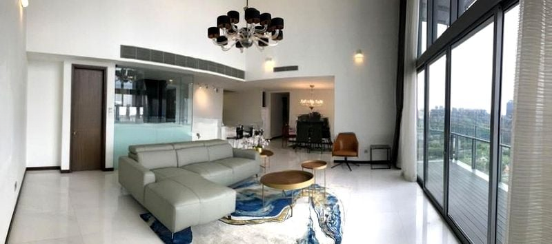 Step into a bright and airy sanctuary where abundant natural light floods through floor-to-ceiling windows, showcasing breathtaking views of the city skyline. The double-volume ceiling enhances the spaciousness, while marble flooring adds a touch of elegance to the open-concept living area. The inviting ambiance is perfect for both relaxation and entertaining, with a balcony featuring wood decking that beckons you to unwind outdoors.