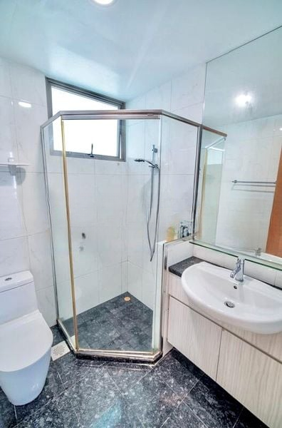 This well-designed 2-bedroom, 2-bathroom unit features an open-concept layout that seamlessly connects the living and dining areas. The living room boasts luxurious marble flooring and an L-shaped sofa, perfect for relaxation and entertainment. The dining area, highlighted by a round wooden table and stylish pendant lighting, is ideal for hosting gatherings. The master bedroom offers a panoramic city view through its corner windows, while the bathrooms showcase a modern black marble countertop and full-height wall tiles, adding a touch of sophistication.